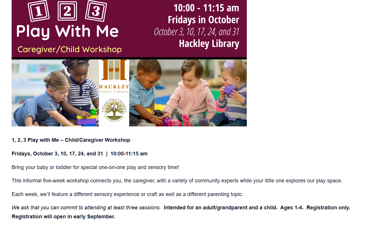 "1,2,3 Play with Me" at Hackley Public Library 10:00 AM to 11:15 AM"1,2,3 Play with Me" at Hackley Public LibraryDate: Oct 17Time: 10:00 AM to 11:15 AMLocation: Hackley Public Library, 316 W. Webster Ave. Muskegon, MI 49440Cost: FREECalendar: Read early. Read often Community Events